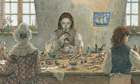 The characters are sensitively observed. With an intimate knowledge of London's galleries and museums, Barrett is constantly gleaning visual inspiration - the doll-maker's daughter has the poise of a child in a Chardin painting, but her hairstyle, Barrett says, was borrowed from the film of Little Dorrit. "I wanted to suggest the tension, the exquisite pain you feel when the hair is tightly pulled back in a bun." Hardly any of her books have a contemporary setting, and this strong feeling for the past extends to Barrett's own surroundings - entering her mansion flat, in a Dickensian part of London, is like stepping into one of her illustrations. She works at a huge desk beneath a mirror, surrounded by artworks and curios. Aside from a digital radio and a propelling pencil, her life seems untouched by modern technology - certainly there's no computer. And if she needs a light box, she simply pushes aside the tasseled drapes and tapes her rough drawings to the window in order to trace images on to watercolour paper.