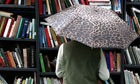 A woman wearing wellington boots and holding an umbrella, looks at outdoor bookshelves Photograph: Martin Godwin/Guardian