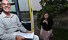 Tanya Gold stretches her legs while tour leader Derrick Swann consults his notes. Photograph: Adrian Sherratt Photograph: Adrian Sherratt/Guardian