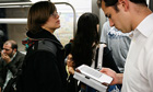 A commuter uses a Blackberry and a Kindle while riding the subway in New York
