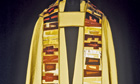 Inspired by the dedication of the new Coventry Cathedral, the Bear Lane Gallery in Oxford arranged an exhibition in 1964 entitled Modern Art in the Church. Pat decided to submit a cope with lettering around the orphrey (the band of embroidery bordering a vestment). This was a big undertaking as buying the fabric was expensive. Fortunately, she had already invested in a Bernina sewing machine. The lettering was designed in freely cut paper, each letter being built up of little strips. In between each word she inserted a cross form. "In a church service," Pat said, "the priest doesn't want to be read up and down, but the letterforms must be there, decipherable if not easily readable." Different colours and textures of yellow, gold and brown were used in this cope, irrespective of whether for background or letter, the lettering being hidden in a richly patterned band.