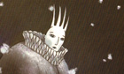 A large snowflake settles on Kay’s window box and grows into the shape of a lady dressed in millions of tiny star-like snowflakes. She is the Snow Queen. The gentle use of pink and green create a magical luminosity to add to the ghoulish gloom of the white, black and blue.