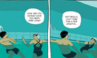 Will the two ever meet outside the pool? It be would giving rather too much away to answer this question, though one of the more striking things about A Taste of Chlorine is that almost – emphasis on almost – every scene takes place in the pool; if shades of turquoise and aquamarine are your thing (they are mine), then you will find this book extraordinarily beautiful. Low on dialogue, it's Vivès's remarkable illustrations that draw you on. They capture superbly well not only the movement of human beings through water, but also the peculiar hallucinatory feeling that being in a public swimming pool often induces: the echoes, the strange tricks of light, the wobbly distortions. When our hero swims on his back, Vivès provides a few frames that reveal nothing more than the glass roof of the pool. When he swims underwater, we sense the pressure on his lungs through the smallest adjustments to his puckered mouth and bulging cheeks. When he is resting at the edge of the pool but feeling the cold, we see only his head and the very tops of his shoulders (because the water is warm, relatively speaking). It's like watching an extremely watery silent movie: evocative, dream-like, mysterious. Never before has the monotony of swimming lengths seemed so appealing.