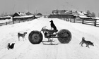 It was in the frozen expanses of Solovki on the White Sea in Russia that Sammallahti made some of his most extraordinary images. Here, the blankness of the landscape, shading into grey forests or skies, is an atmosphere in itself. Wolfish dogs and solitary birds feature in many of the images, survivors in a harsh, beautiful environment where everything – rivers, lakes, skies and bare trees – seems frozen into stillness. He also captures the changing of the seasons – snow giving way to mud, a different kind of grey making the landscape an entirely different world.