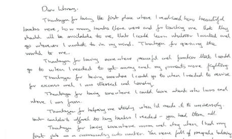Thank you for being the first place I realised how beautiful books were, how many books there were and for teaching me that they should all be available to me, that I could learn whatever I wanted and go wherever I wanted to in my mind. Thank you for opening the world to me.