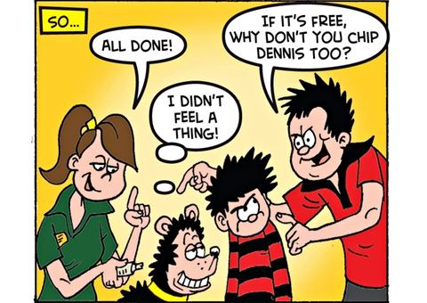 In a special strip, Dennis and Gnasher end up at a re-homing centre, where they discover that Gnasher has not been chipped. Dennis’s oversight is soon rectified – and Gnasher comments: “I didn’t feel a thing.”
