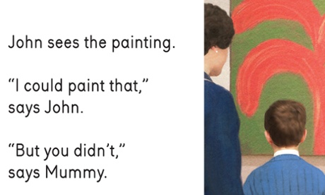 Like Peter and Jane, We Go to the Gallery consists of simple scenes with new vocabulary at the bottom of each page. Rereleased in a mass-market edition this week, the book is funny, smart and – to any parent who has tried to introduce small children to modern art – excruciatingly recognisable. “The rubbish smells,” says the girl, standing before a binbag installation. “‘It is the stench of our decaying Western civilisation,” says Mummy.” Along the bottom, the new-words panel lists: “rubbish smells western”.