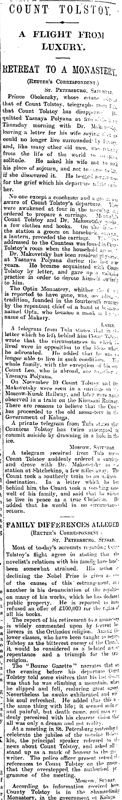In November 1910 the Manchester Guardian reported that Tolstoy had fled his family estate accompanied by his doctor. As Tolstoy’s health declined and he became further removed from society, his family relations grew increasingly strained. The report speculated that tensions were fuelled by Tolstoy’s refusal of royalties and the Nobel prize.